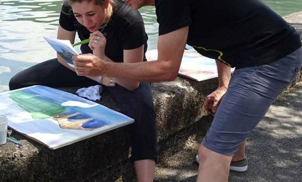 Der regionale Künstler Herwig Strobel arbeitete mit den Schülern/innen Landschaftsaquarelle aus, die als motivischen Ausgangspunkt den Zeller See hatten. Hinzugefügt wurden dann andere Landschaftsteile von eigenen Fotografien oder aus dem Internet. So entstand eine ganz eigene Kulisse. Gearbeitet wurde vor Ort, d.h. am Zeller See, bei herrlichstem Wetter, das zusätzlich motivierend auf die Gestaltung des Aquarells wirkte. Hr. Strobel unterstützte die Schüler/innen in all ihren eigenen Vorstellungen, half bei technischen Problemen und beim Platzieren der neuen Landschaftsteile (von Fotos) in das bestehende Aquarell vom Zeller See. Um der Aquarelltechnik eine neue technische Raffinesse zu geben, wurde bei gewissen Bildteilen mit Pastellkreide hineingearbeitet, das dem Aquarell natürlich noch zusätzlich Struktur und Tiefe gab.