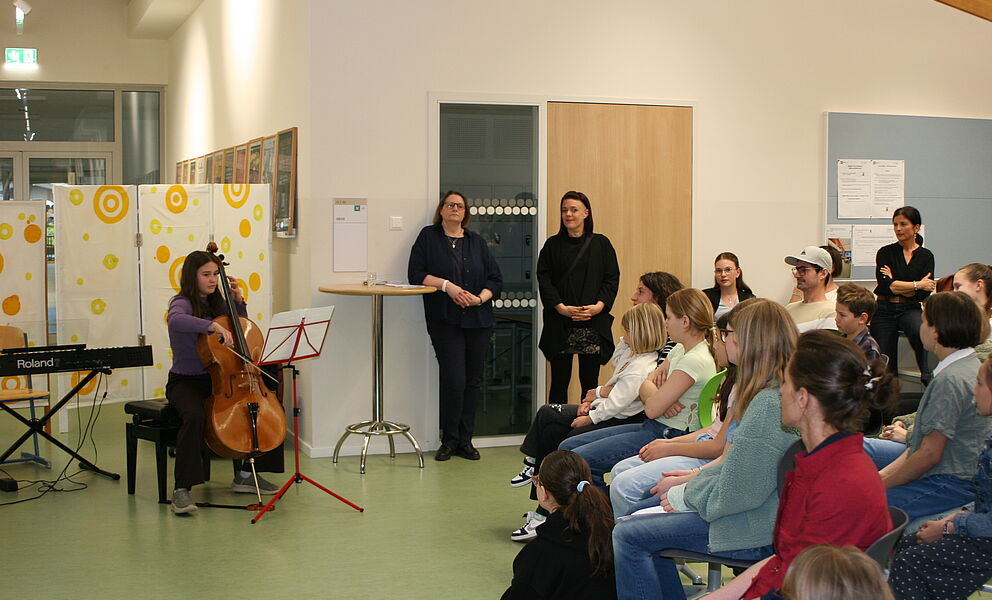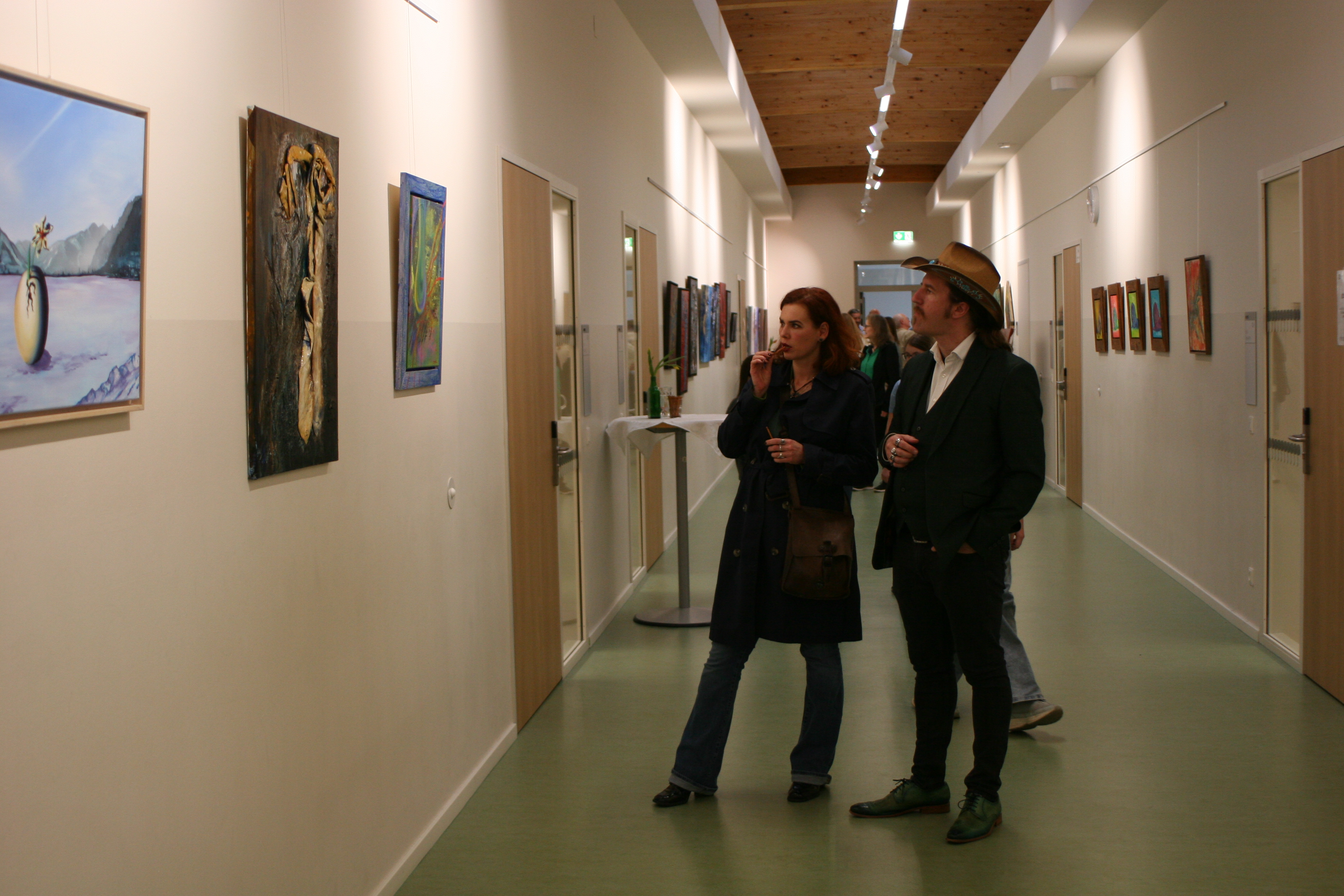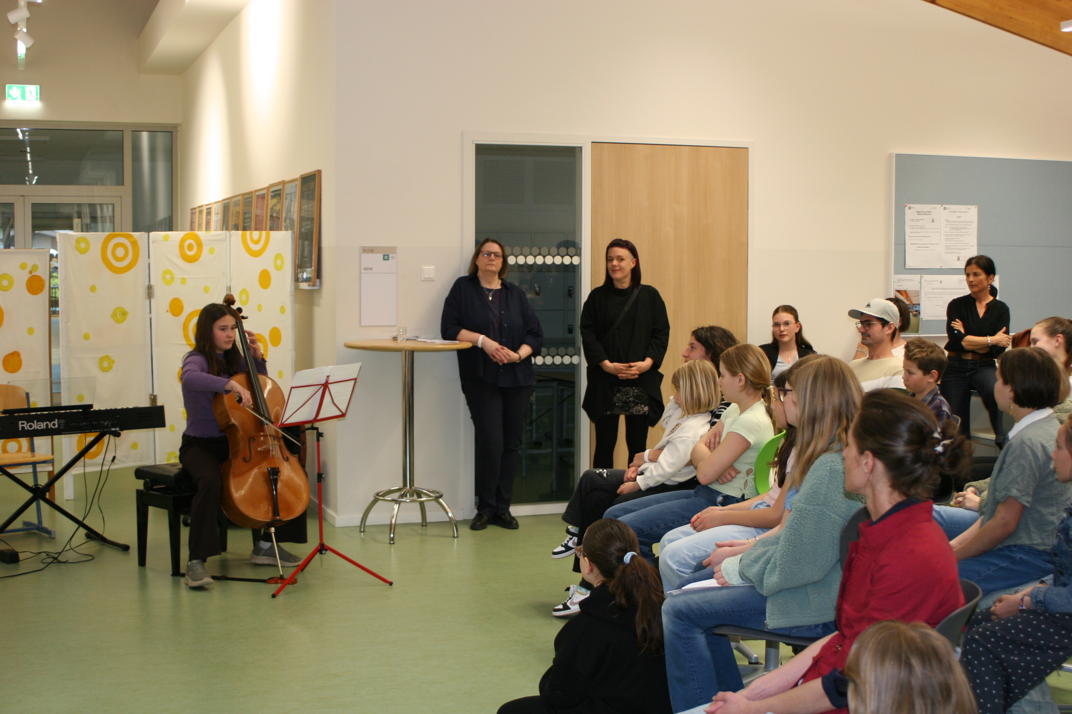 Am 16. April 2026 war es endlich wieder so weit. Unsere Schule lud zur ersten Ausstellung im neuen Bundeschulzentrum in Zell am See ein. Mag. art. Claudia Trentini bespielte die Wände der Schulgalerie mit eindrucksvollen Bildern aus den letzten zehn Jahren ihres künstlerischen Schaffens. Zu diesem Anlass gab es eine feierliche Eröffnung mit musikalischen Talenten aus unserer Schule: Anna-Lena Schwaiger, Vivien Rohm und Samuel Leitner umrahmten mit Querflöte, Cello und Klavier die Eröffnungsreden und ernteten dafür tosenden Applaus.