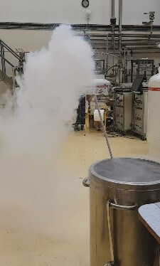 Im Rahmen unseres Projektes im Cryolab haben mein Partner und ich uns mit Wärmeübertragungsvorgängen an unterschiedlichen Oberflächen befasst. Ziel war es, den Wärmeübertragungskoeffizienten wie auch die Wärmeleitfähigkeit vom Übergang einer Aluminiumoberfläche zu Flüssigstickstoff experimentell zu bestimmen. Dafür nutzten wir einen Pt100, ein Bauteil aus Platin, das seinen Widerstand abhängig von der Umgebungstemperatur in einer Kalibrationskurven zu entnehmender Weise ändert. Dies bedeutet, dass man über eine Messung des Widerstandes (R = U / I) auf die Temperatur schließen kann. Ein Ergebnis unserer Untersuchung ist ein Graph, der den Wärmestrom („heat flux“) als Funktion der Temperatur angibt. Man kann daraus gut erkennen, dass anfangs, wenn ∆T von 220K auf 27K sinkt, der Wärmestrom ebenfalls nahezu linear abnimmt, dann jedoch plötzlich ein Spike auftritt und danach die zwei Materialien im thermischen Gleichgewicht (gleiche Temperatur, ∆T = 0) sind. Dies entsteht dadurch, dass anfangs eine Schutzschicht aus gasförmigen Stickstoff besteht, die die Wärmeübertragung hindert (Leidenfrost-Effekt). Mit dem Verschwinden dieser kann jedoch auch Wärme leichter übertragen werden, was den erhöhten Wärmestrom erklärt.