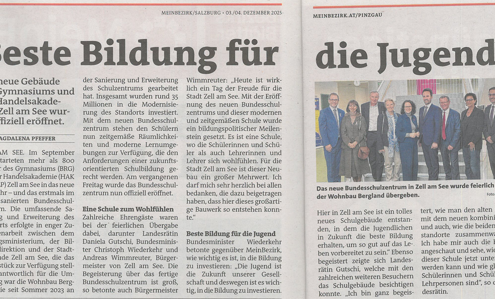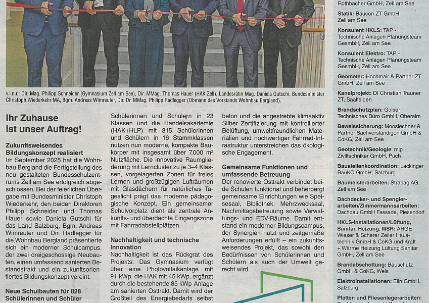 In einem feierlichen Festakt wurde allen Ausführenden und Mitwirkenden an der gelungenen Umsetzung des neuen Schulzentrums gedankt, u.a. Wohnbau Bergland als engagierter Bauträger mit vielen regionalen Firmen, aber auch den Mitgliedern der Schulgemeinschaft, von den Schulwarten und Sekretärinnen, Lehrkräften bis hin zu den Schüler:innen, die gemeinsam eine intensive Bauphase ertragen und mitgetragen haben.
