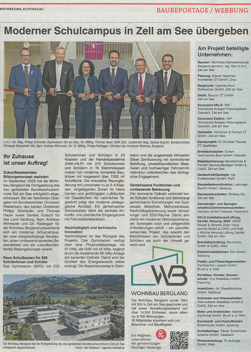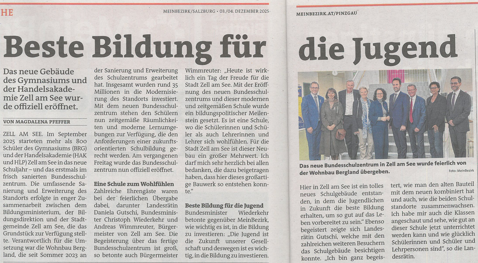 In einem feierlichen Festakt wurde allen Ausführenden und Mitwirkenden an der gelungenen Umsetzung des neuen Schulzentrums gedankt, u.a. Wohnbau Bergland als engagierter Bauträger mit vielen regionalen Firmen, aber auch den Mitgliedern der Schulgemeinschaft, von den Schulwarten und Sekretärinnen, Lehrkräften bis hin zu den Schüler:innen, die gemeinsam eine intensive Bauphase ertragen und mitgetragen haben.