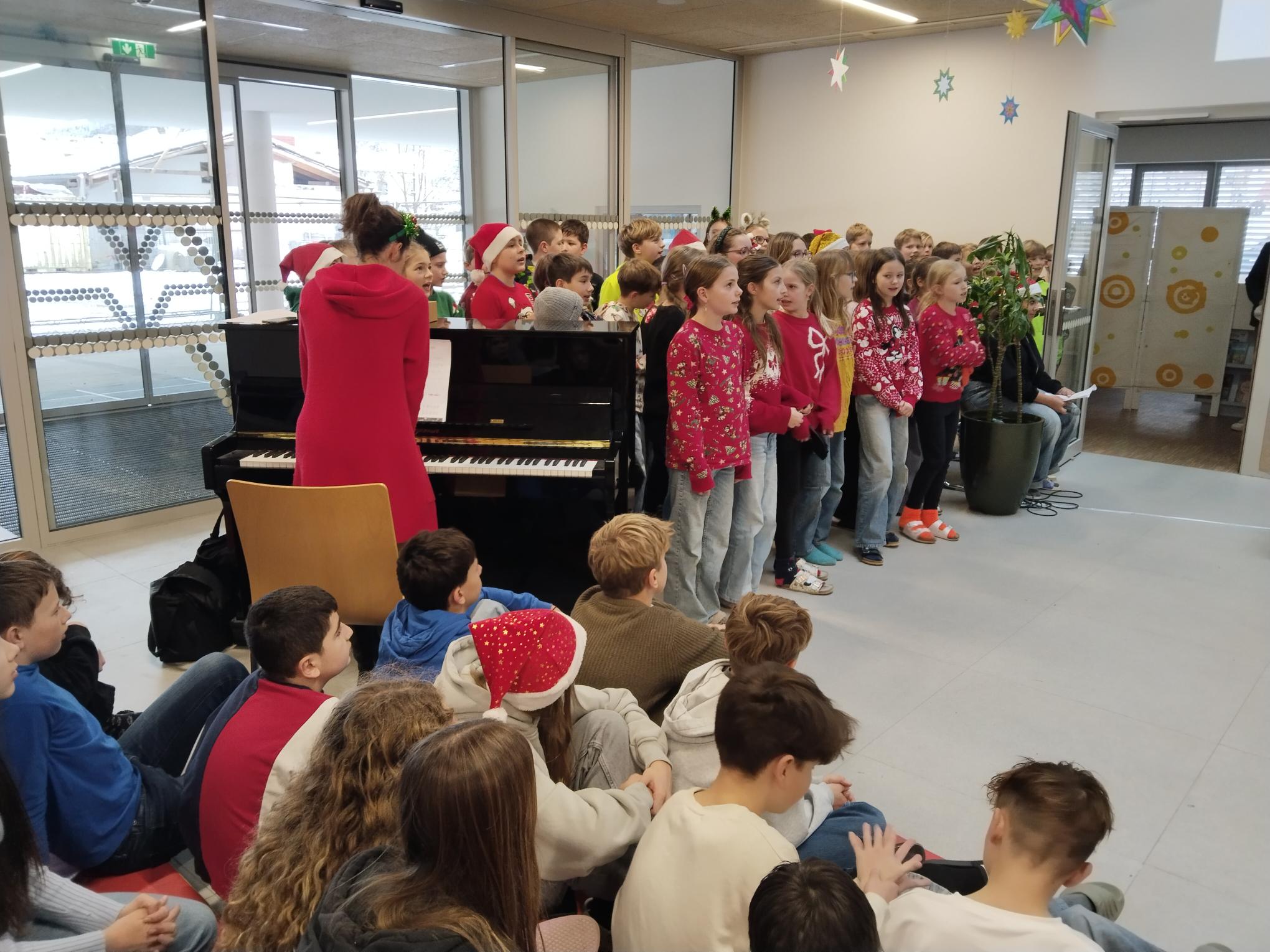 Die SchülerInnen der Unter- und Oberstufe durften am Freitag den 20.12.2024 im neuen Schulfoyer eine bunte Weihnachtsfeier erleben. SchülerInnen der 5. Klassen bliesen und trommelten die SchülerInnen in der großen Pause an verschiedenen Standorten der Schule zusammen, bevor in der 4. Stunde die UnterstufenschülerInnen gemeinsam ein unterhaltsames Theaterstück "Weihnachten wird abgeschafft", sowie stimmungsvolle Musikbeiträge und Texte erleben durften. In der 5. Stufe wurde die Feier mit den OberstufenschülerInnen durchgeführt, die mit einem Jingle Bells in Latein in die Weihnachtsferien überleiteten.