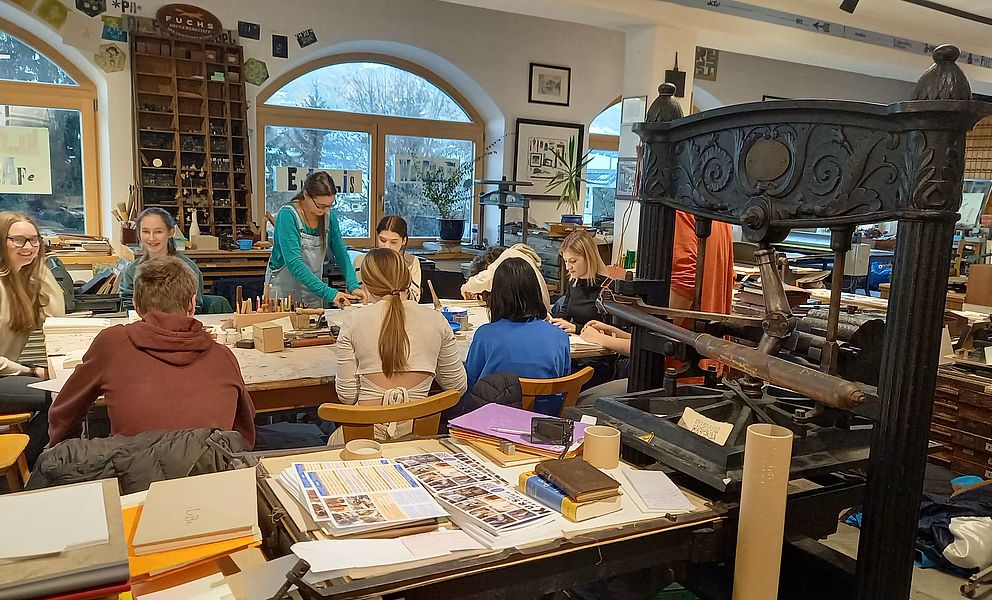 Ein von OeAD und Schule mitfinanzierter Workshop in der Buchbinderei Fuchs ermöglichte uns im Februar einen interessanten Einblick in die uralte Kunst des Buchbindens. Wir wurden dort von Herrn Christian Fuchs, dem Leiter des Unternehmens, herzlich empfangen und nachdem er uns einige Grundsätze der Buchbinderei nähergebracht hatte, wurden wir durch das kunterbunte Innere des weitläufigen Gebäudes geführt. Dort machten wir Bekanntschaft mit zahlreichen Angestellten, die uns einen Einblick hinter die Kulissen ihres Handwerks ermöglichten. Zwischen uralten verstaubten Schmökern und der überwältigenden Speisekartenkollektion des Hauses (wie Herr Fuchs nebenbei bemerkte, sei seine Buchbinderei auf dem Gebiet der hochwertigen Speisekartenproduktion marktführend – weltweit (!)) durften wir den verschiedenen Arbeitsprozessen in den Werkstätten beiwohnen.